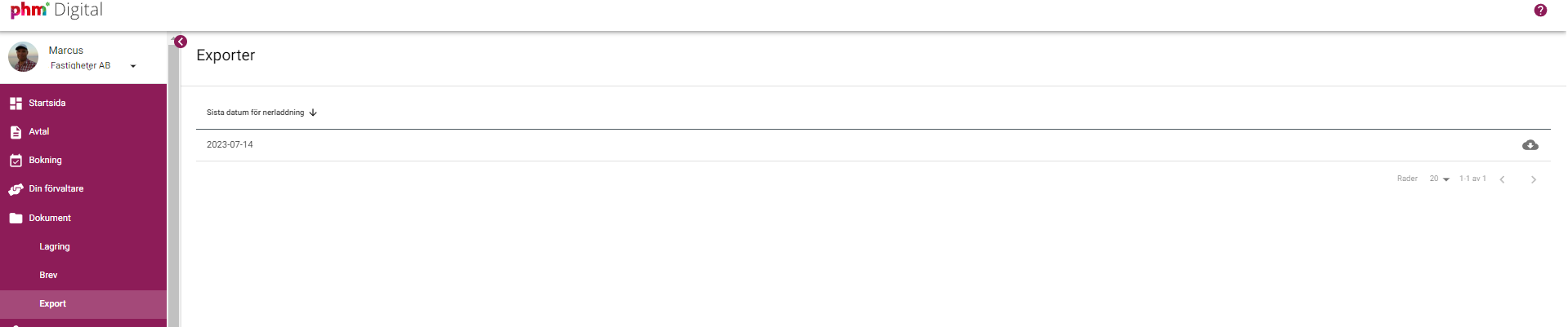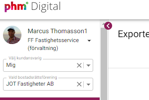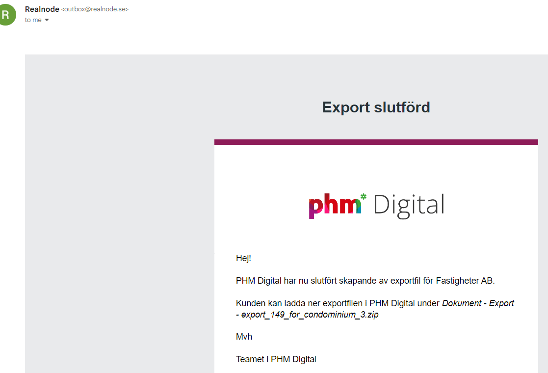 Observera att bokföringsinformation, medlemsregister, lägenhetsregister och liknande inte ingår i exporten. Exportfunktionen är enbart avsedd för att tillhandahålla kundens egna dokument och filer som har lagrats i PHM Digital samt de dokument som har skapats av systemet t.ex leverantörsfakturor och bokföringsunderlag.