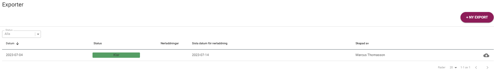 - Be kunden nu logga in i styrelseportalen och välja Dokument - Export, där finns nu en ny export att ladda ner. Exporten kan ladda ner inom 30 dagar.