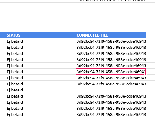 - Notera att den sista kolumnen i filen innehåller filnamnet för det underlag som tidigare skapats åt kunden. Denna referens gör det enklare för kunden att koppla en leverantörsfaktura till rätt PDF-fil.