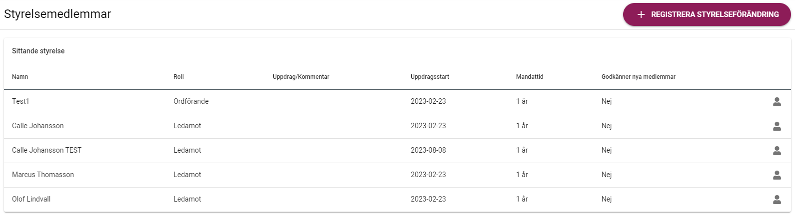 Förvaltaren behöver sedan lägga in vilken/vilka styrelseledamöter som ska godkänna och signera medlemsansökan. Det går att göra en inställning i styrelsevyn för att markera vilka i styrelsen som har ansvar för medlemsgodkännanden.