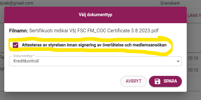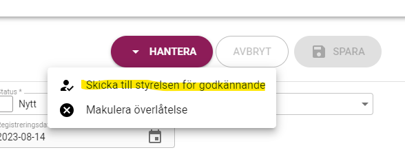 När alla dokument är uppladdade till rätt sektion, styrelseledamöter är tillagda som signerande part och eventuella kreditupplysningar är utförda så är det dags att skicka ut överlåtelsen till styrelsen för godkännande.