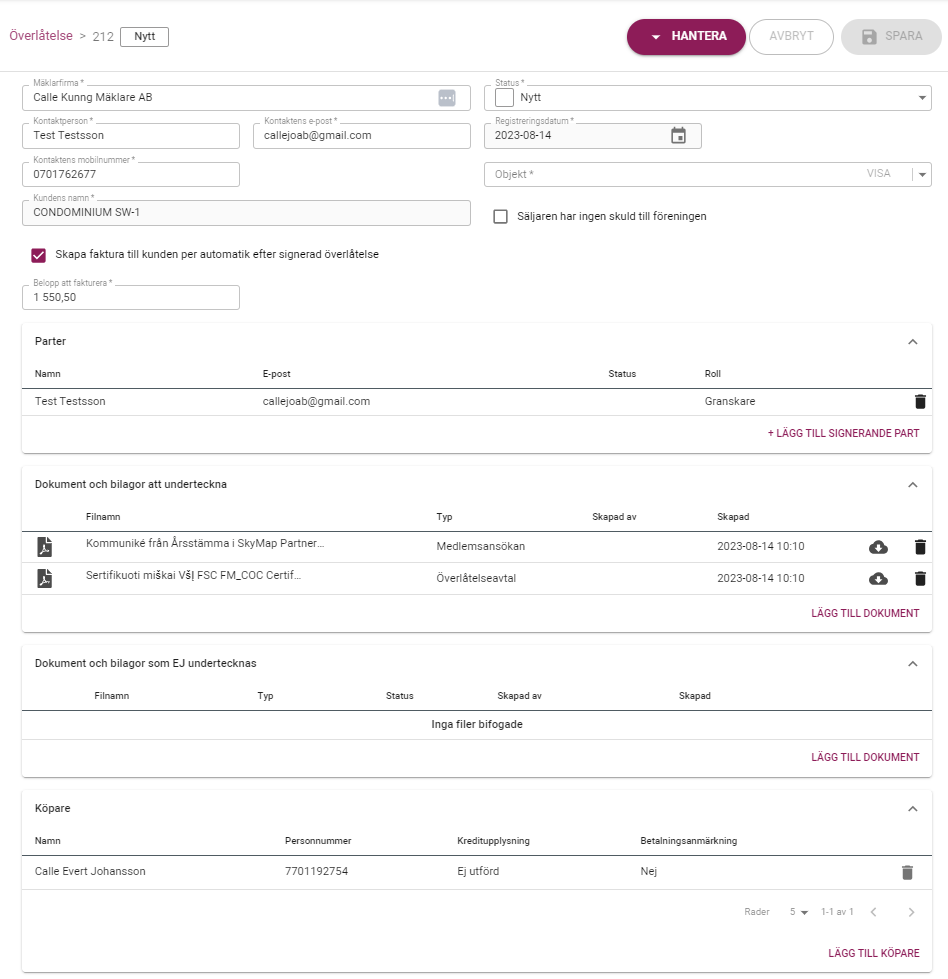 Det är obligatoriskt för mäklaren att lägga till Köpare samt att ladda upp medlemsansökan och signerat överlåtelseavtal.