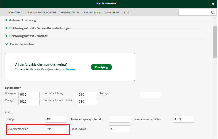 Inget leverantörsfakturakonto (2440 på första raden är inte utgråat)