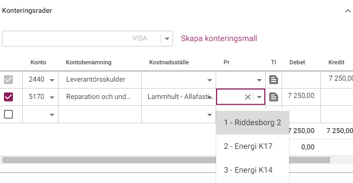 Om projekt är aktiverat i Fortnox, kommer PHM Digital att synkronisera och visa alla projekt från Fortnox. Dessutom läggs en kolumn med projektinformation till under konteringsrader på inkommande leverantörsfakturor.