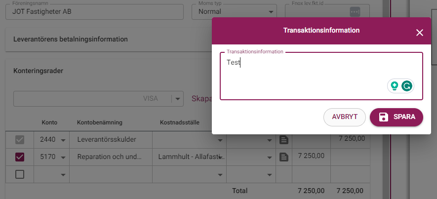 Om funktionen för transaktionsinformation är aktiverad (vilket är standardinställningen) i Fortnox, har förvaltaren möjlighet att lägga till en anteckning som kommer att visas på verifikationsraderna. Det är dock viktigt att notera att denna transaktionsinformation inte kommer att synas på de konteringsrader som presenteras för attestanterna.