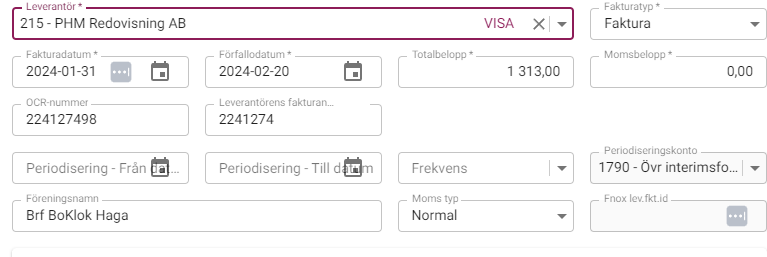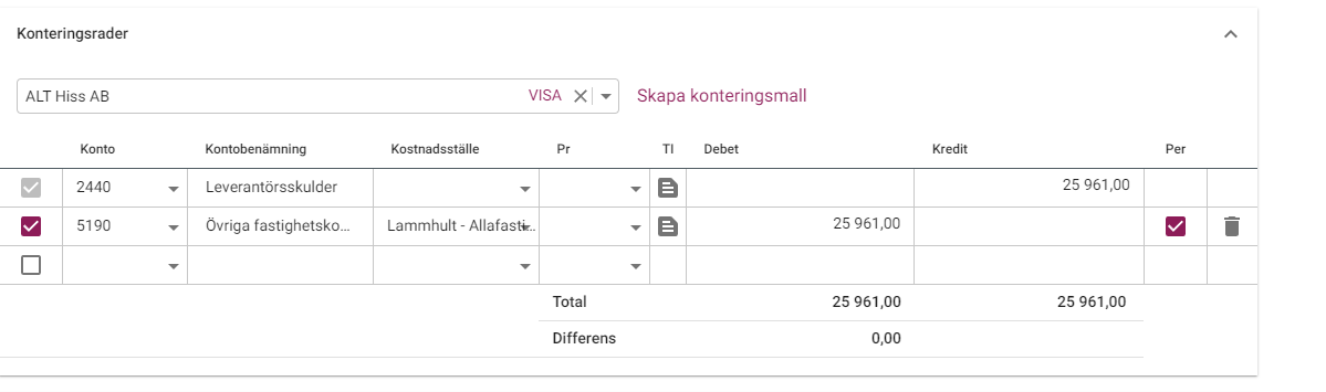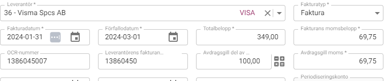 2. Förslag på Bokföring: Om det finns en konteringsmall kopplad till leverantören föreslår systemet automatiskt hur bokföringen ska hanteras. Om inte måste användaren manuellt bokföra fakturan.