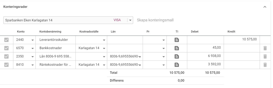 Om förvaltaren har skapat lån för en kund i PHM Digital och kopplat dessa lån till olika bokföringskonton för lån och ränta (inne på lånet), kommer PHM Digital att automatiskt visa kolumnen 'lån' på konteringsraderna på leverantörsfakturan.