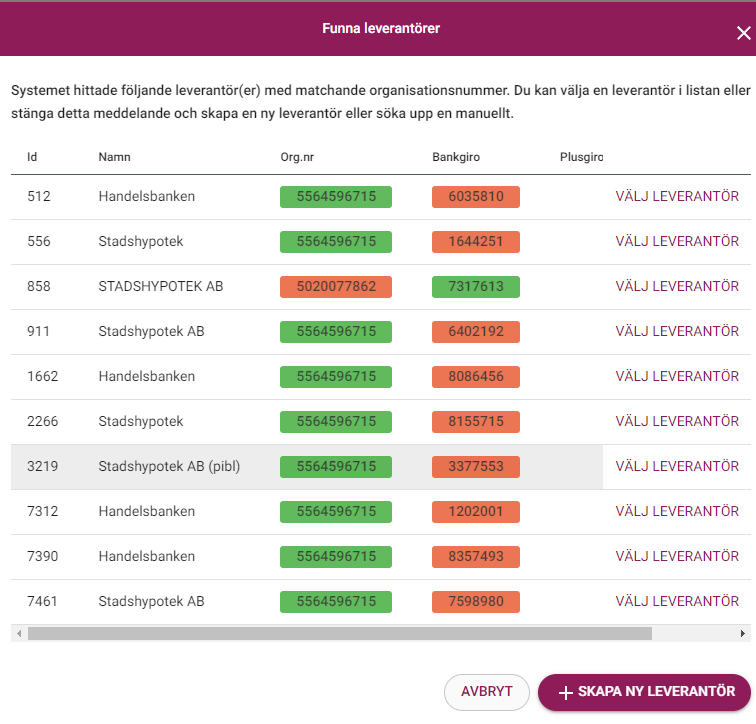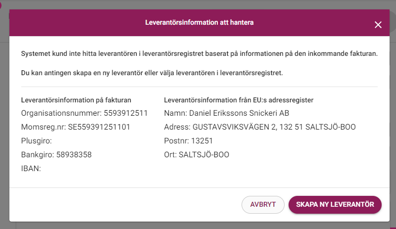 Leverantören matchar inte med det befintliga leverantörsregistret.
