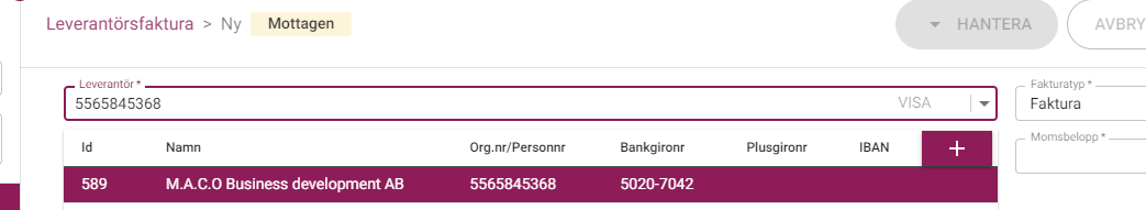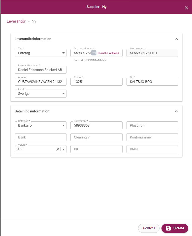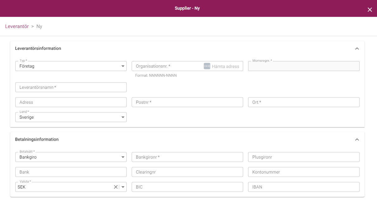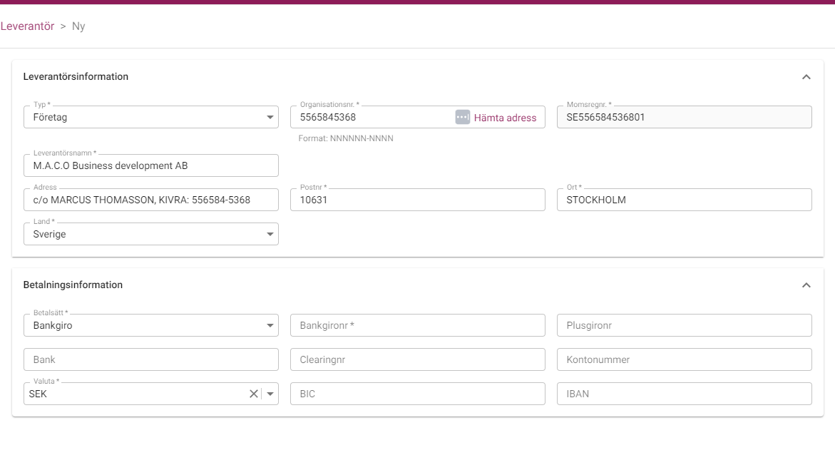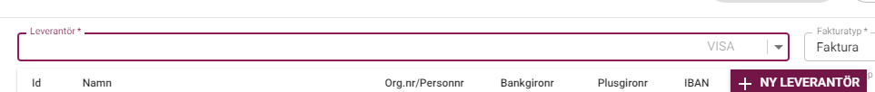 En användare har möjlighet att skapa en ny leverantör i systemet. Det är viktigt att notera att systemet endast tillåter registrering av en unik kombination av organisationsnummer, bankgiro och plusgiro för varje leverantör.