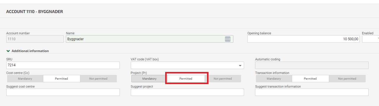 - Aktivera möjligheten att bokföra på projekt genom att sätta 'Projekt' till aktivt.