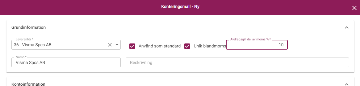 Förvaltaren har också möjligheten att ange en specifik momssats för en leverantörs konteringsmall. Denna sats kan sedan tillämpas i de fall där moms faktiskt ska användas.