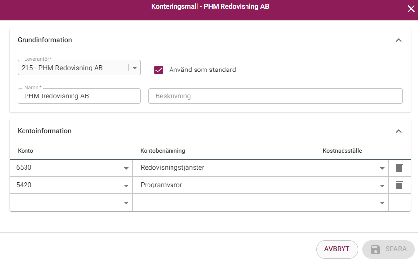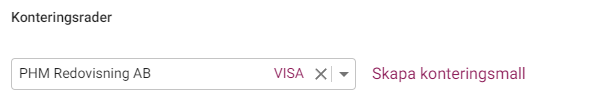 Förvaltare har möjligheten att i PHM Digital koppla en eller flera konteringsmallar till en specifik kund. Det finns även alternativ för användaren att välja en av dessa konteringsmallar som standardmall.
