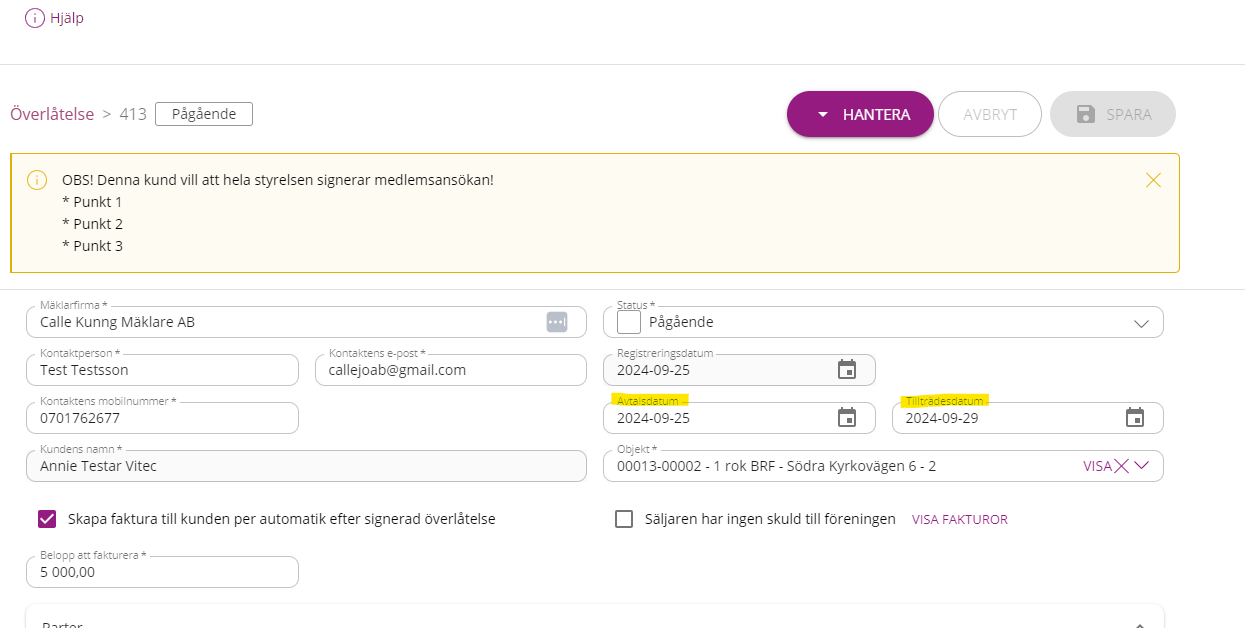 Det finns nu möjlighet för förvaltare och mäklare att lägga in Avtalsdatum och Tillträdesdatum när en överlåtelse registreras.