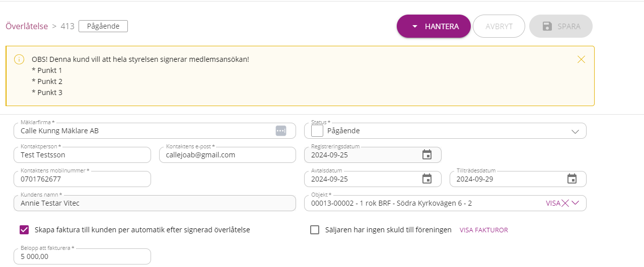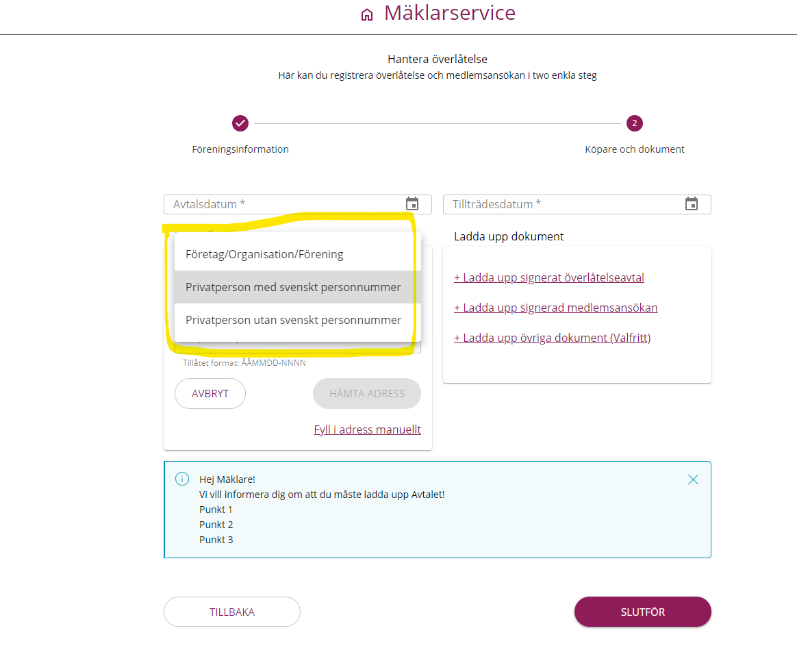 Skriv informationstext till mäklaren om hantering av Överlåtelse