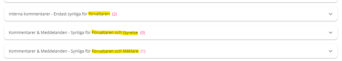 I den andra rutan skriver ni kommentarer som delas med styrelsen. När en styrelseledamot skriver en kommentar inne på en överlåtelse så visas den här.