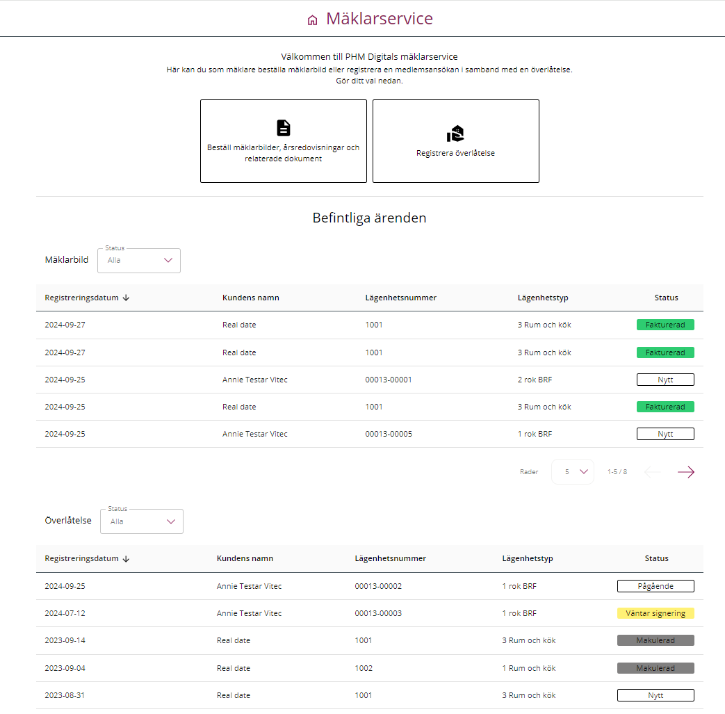 I den nya mäklarportalen kan mäklaren följa status på sin beställning.