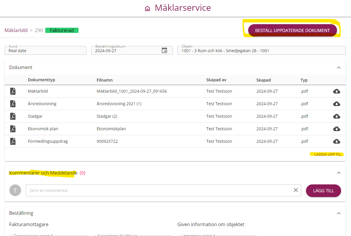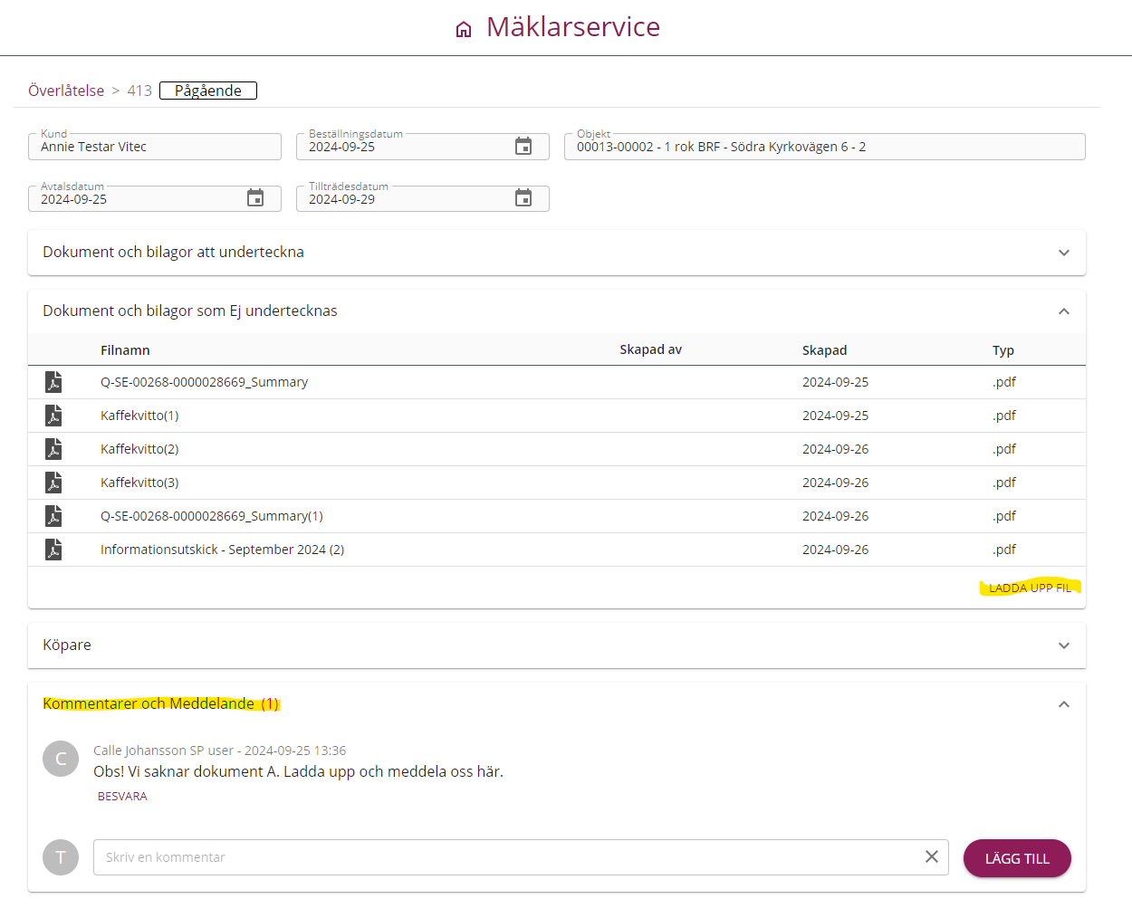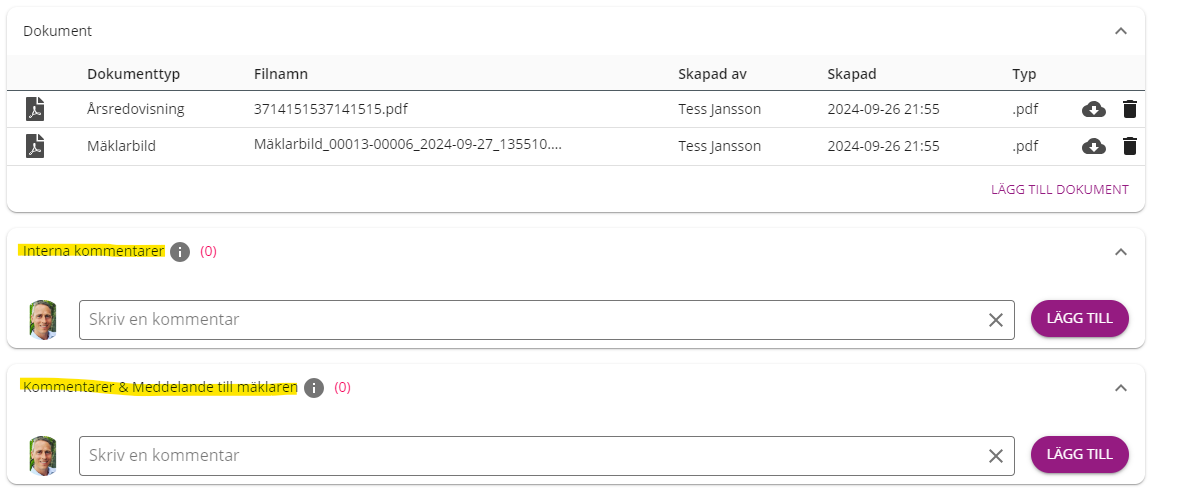 Mäklaren kan skriva kommentarer och meddelanden till förvaltaren och även komplettera mäklarbilden med nya dokument.