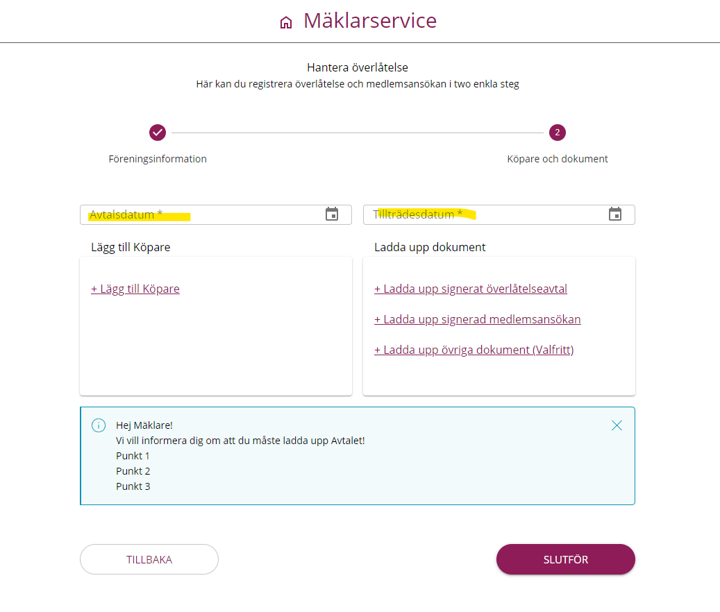 Mäklaren kommer kunna gå in i detaljvyn på en överlåtelse och ladda upp dokument och läsa och skriva meddelanden.