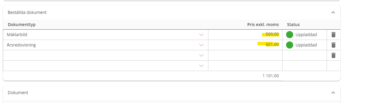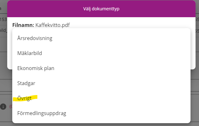 Mäklaren kan även ladda upp dokument av typen Övrigt när överlåtelsen registreras.