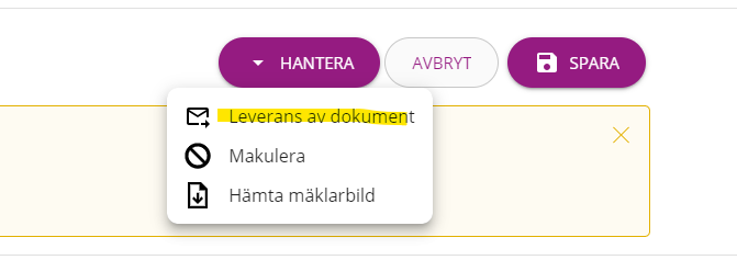 När ni är klara med alla dokument som mäklaren beställt och väljer Leverans av dokument så kommer dokumenten inte längre att bifogas i ett mäklaren. Istället kommer mäklaren få ett mail där man uppmanas att logga in i mäklarportalen och ladda ner dokumenten.