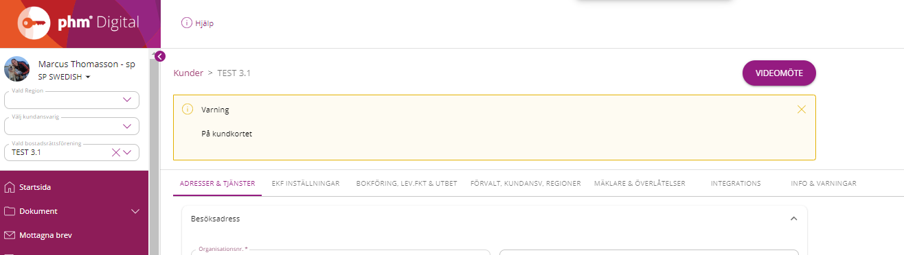 Det går att skriva kundunika interna upplysningar och varningar som visas upp för er förvaltare inne på överlåtelsen. Det kan vara diverse noteringar krig specifika dokument som krävs eller unik hantering för en viss kund. Ni lägger in denna information på kundkortet på fliken Information & Varningar.