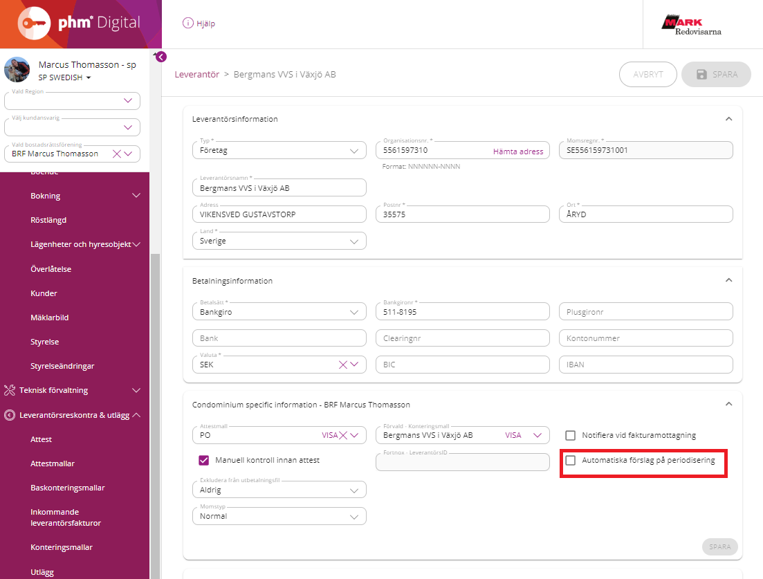 Ni måste därefter aktivera varje leverantör som ni önskar ska periodiseras. Detta gör ni antingen i kundens leverantörsregister eller genom att klicka på leverantören när ni står på en faktura och välja automatiska förslag på periodiseringar. I framtida versioner planerar vi att alla leverantörer automatiskt märks för periodisering när ni aktiverar funktionen. I denna första version är vi dock mer försiktiga, och ni behöver manuellt välja vilka leverantörer som ska hanteras.