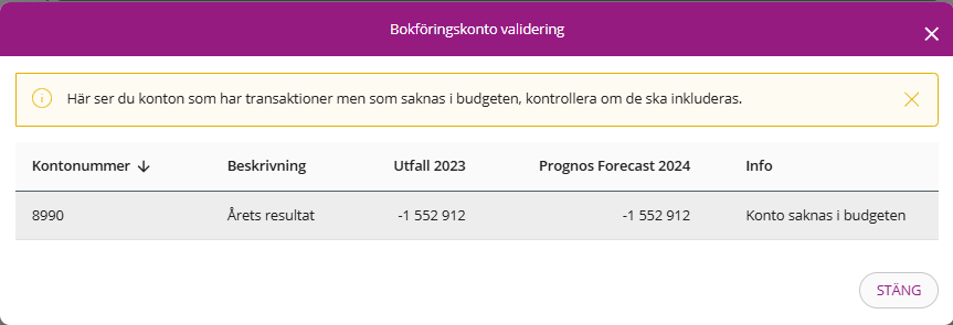 - Denna vy används för att identifiera bokföringskonton som finns i företagets bokföring men saknas i den skapade budgeten. Syftet med valideringen är att säkerställa att alla relevanta konton är inkluderade i budgeten.