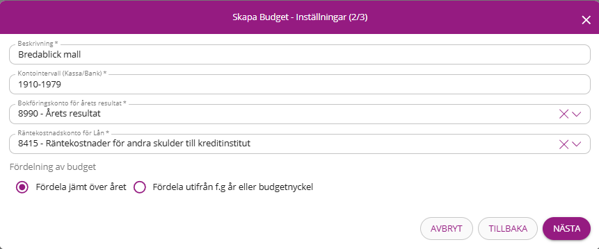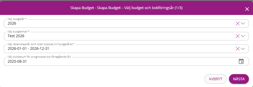 När du klickar på knappen "+Budget" i listvyn för budgetering startar en guide som hjälper dig skapa en ny budget utifrån vald budgetmall. Guiden består av tre steg: