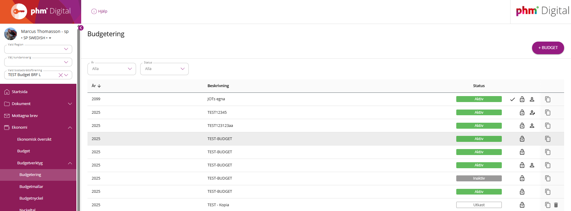 - Knappen "+Budget" blir aktiv endast när en specifik kund är vald i navigeringsmenyn under "Vald bostadsrättsförening".