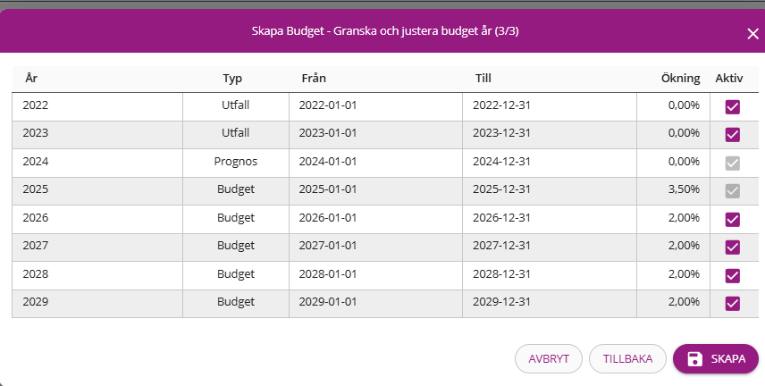 - Du kan välja upp till totalt fem budgetår och två utfallsår, plus ett prognosår.