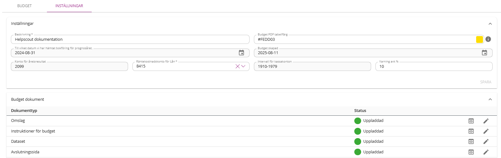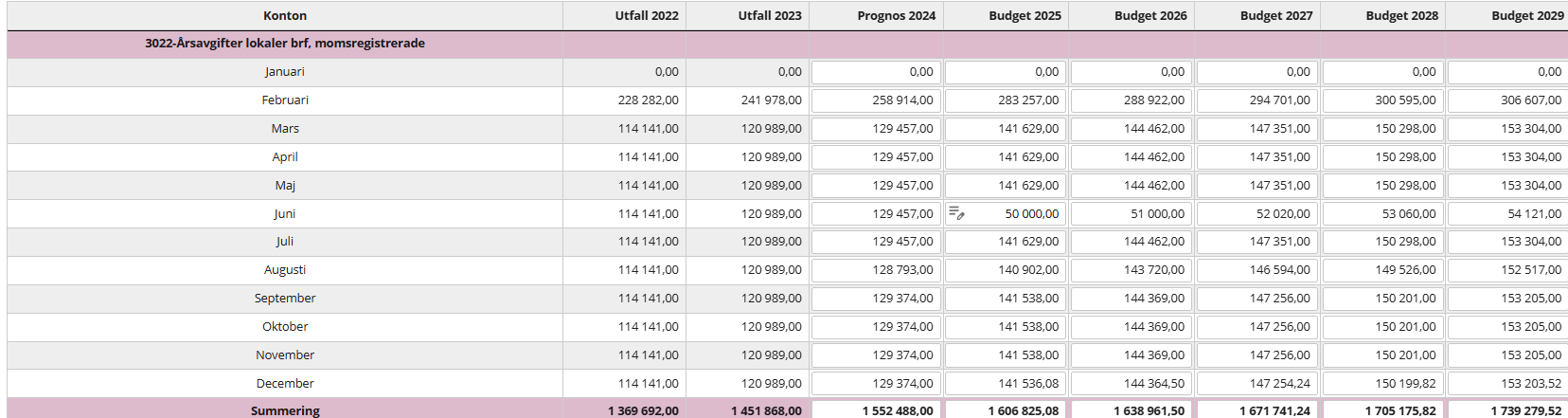 - Redigerbar för kund: Visar om kunden kan redigera budgeten i styrelseportalen.