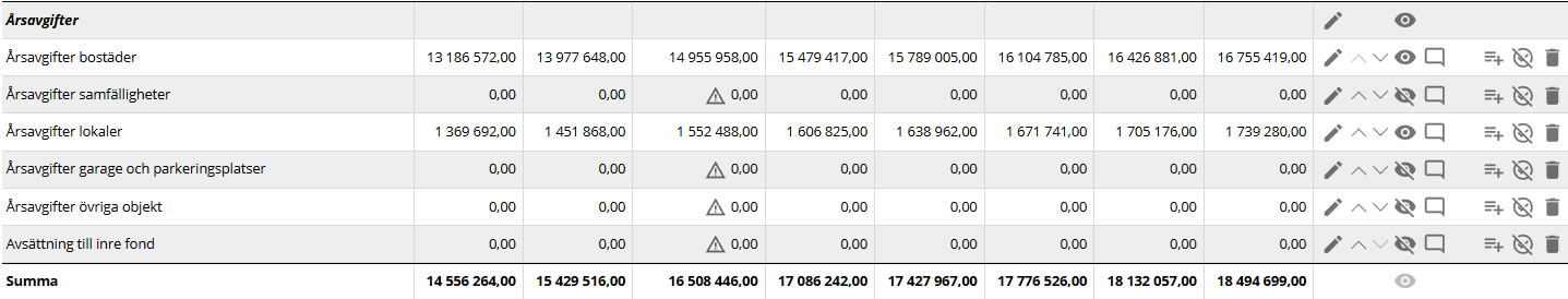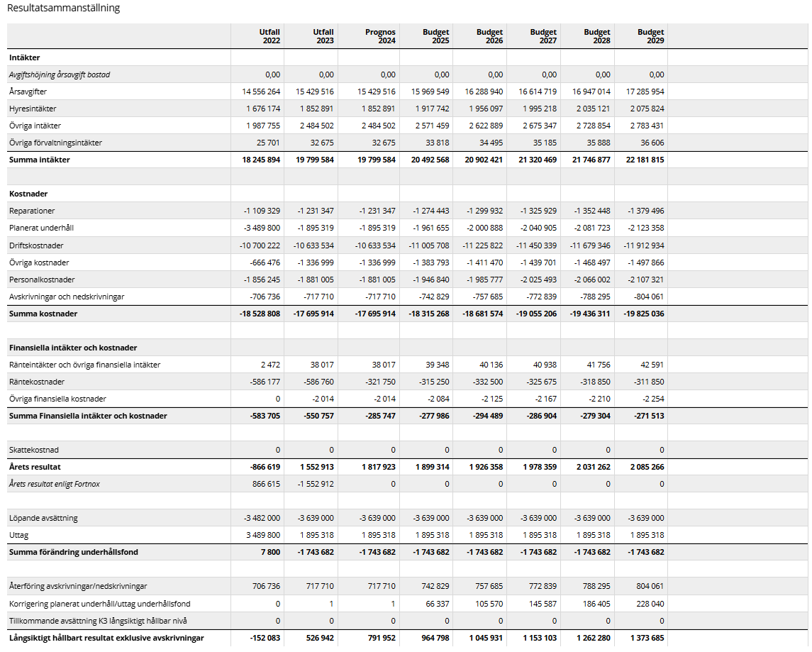 - Extra/tillkommande avsättning (K3) – Visas om K3-regelverket används. Inkluderar extra planerat underhåll eller uttag ur underhållsfonden.