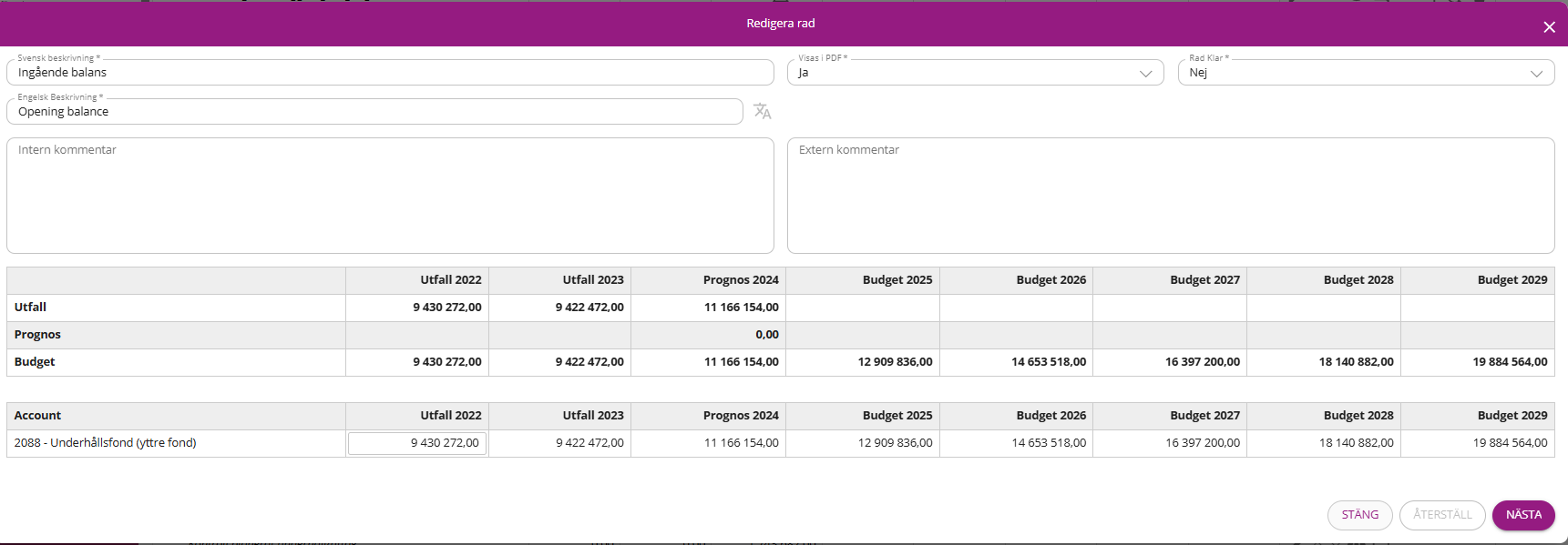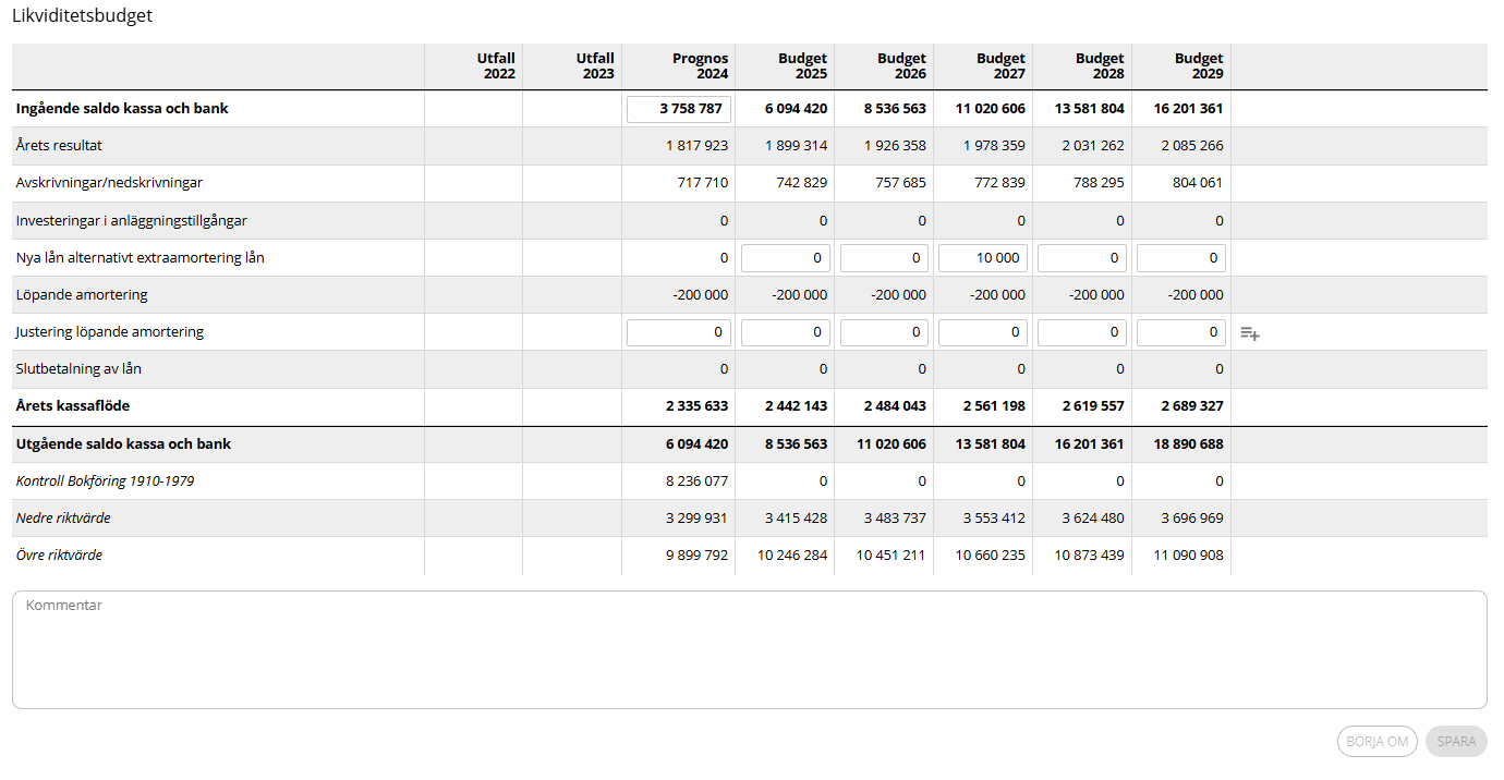 - Ingående saldo kassa och bank – Hämtas från bokföring vid budgetimport. För efterföljande år beräknas värdet från föregående års utgående saldo.