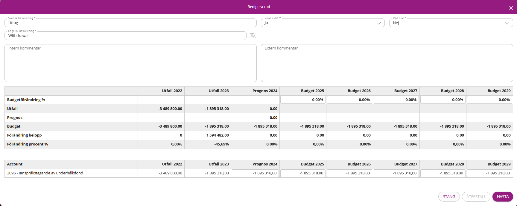 - En godkänd budget kan inte redigeras direkt. För att göra ändringar måste man först backa godkännandet och sedan låsa upp budgeten.