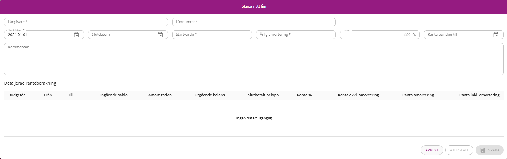 - Se uppdelning när räntan är bunden en del av året och rörlig resten – systemet visar då separata rader för respektive period.