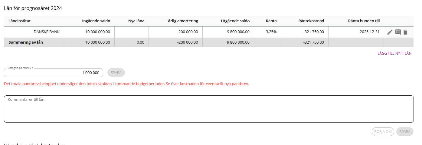 När du klickar på Redigera på ett befintligt lån öppnas en vy som visar exakt hur räntan är beräknad per år. Här kan du: