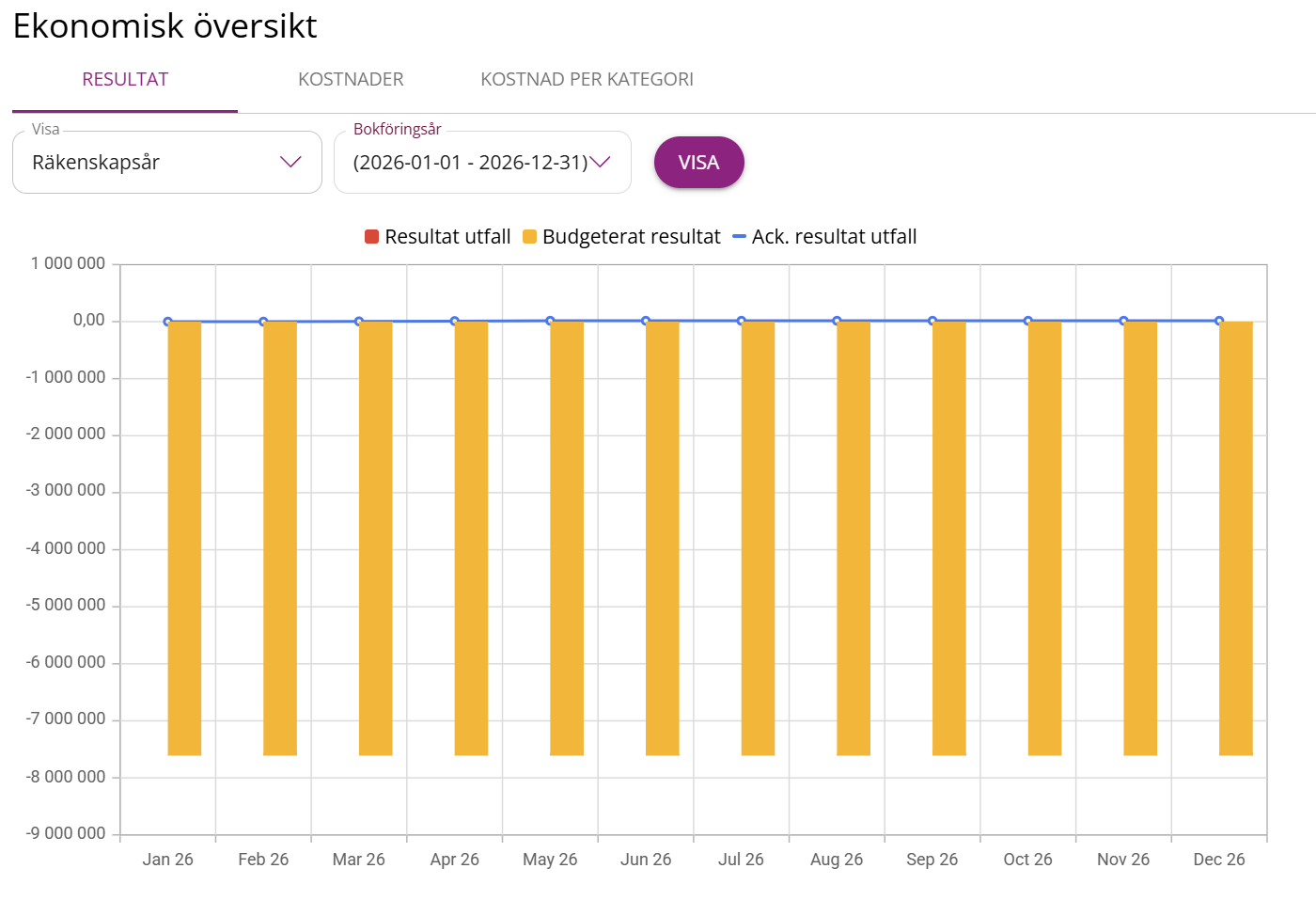 - Ack. resultat utfall (Blå linje): En trendlinje som visar det sammanlagda (ackumulerade) resultatet över tid. Denna är avgörande för att se om verksamheten rör sig mot ett positivt eller negativt årsresultat.