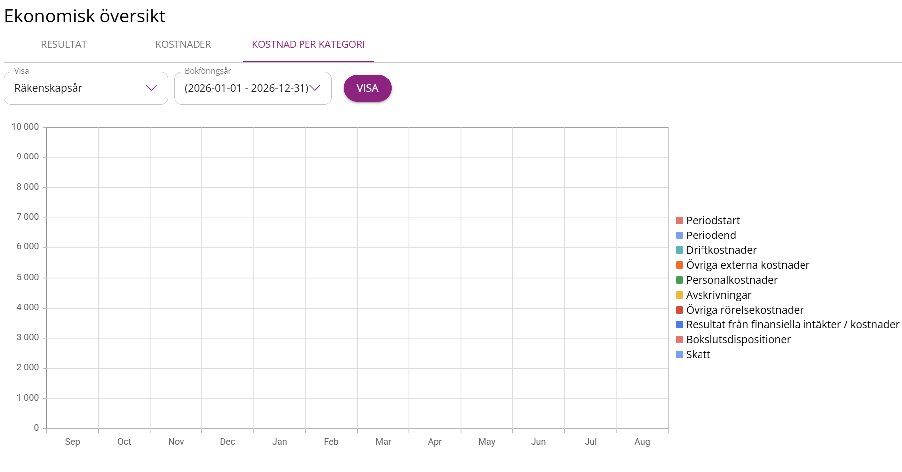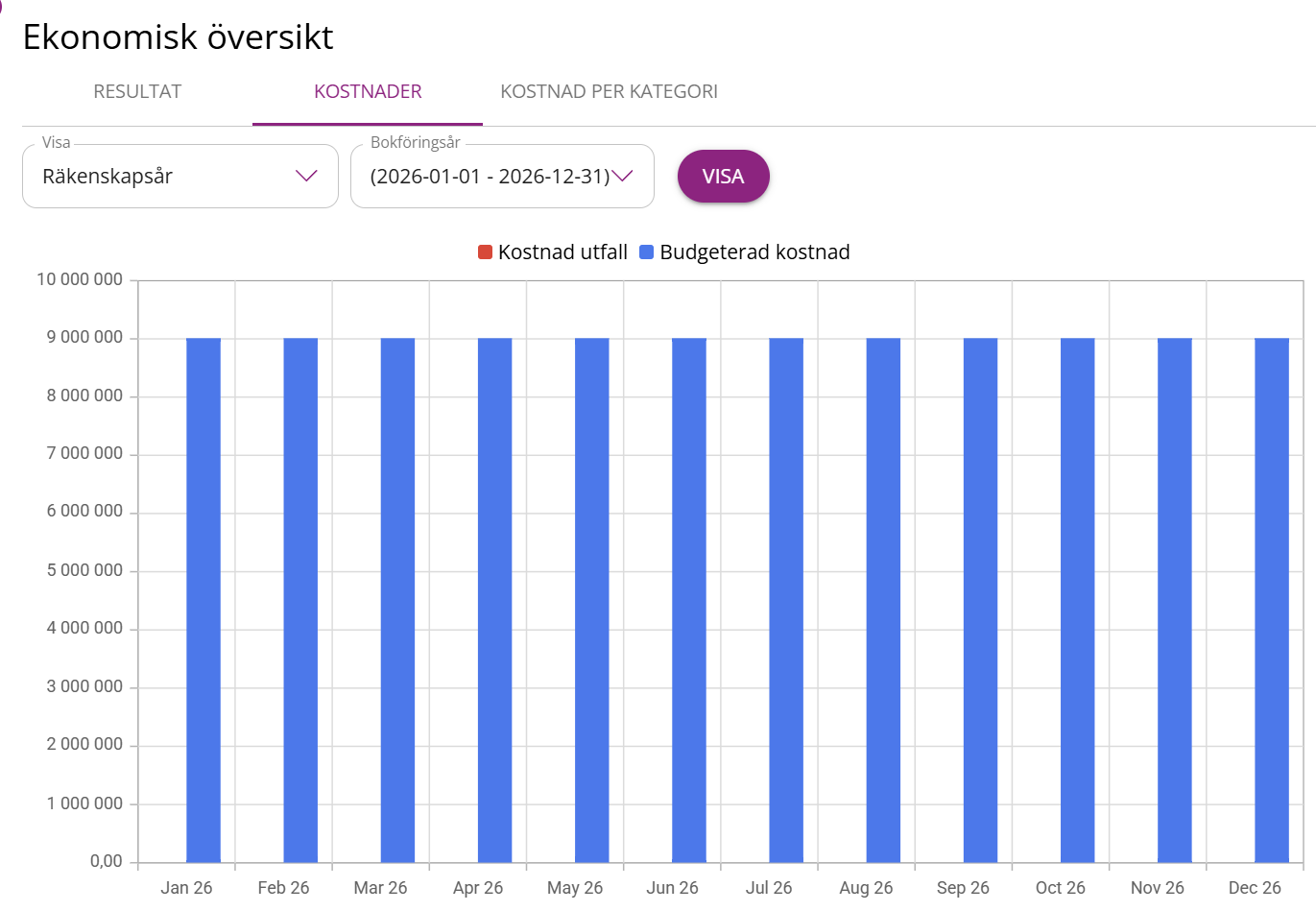 - Användningsområde: Använd denna vy för att identifiera månader med ovanligt höga kostnader eller för att kontrollera om kostnadskontrollen följer de satta ramarna.
