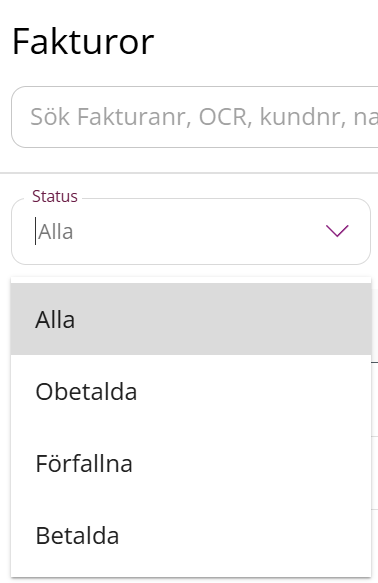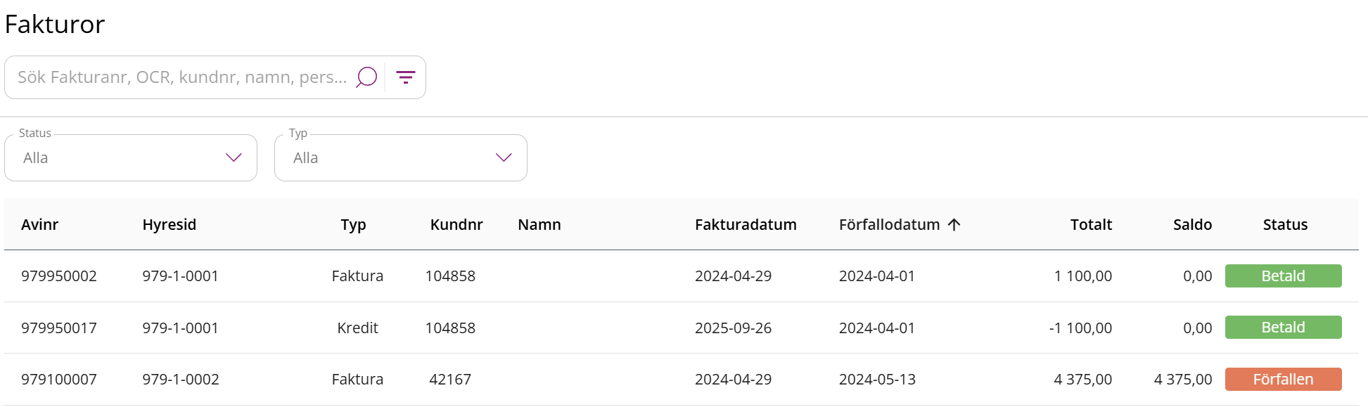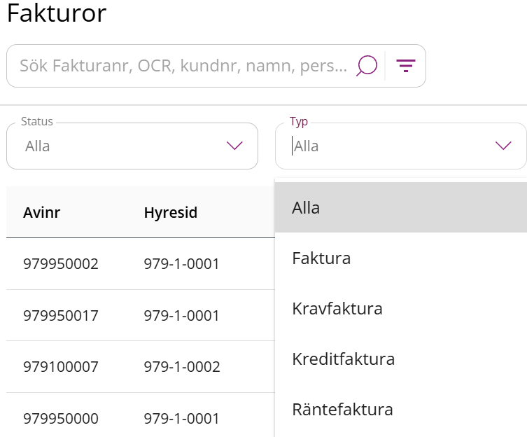 Du kan effektivisera din sökning genom att sortera listan efter fakturatyp:
