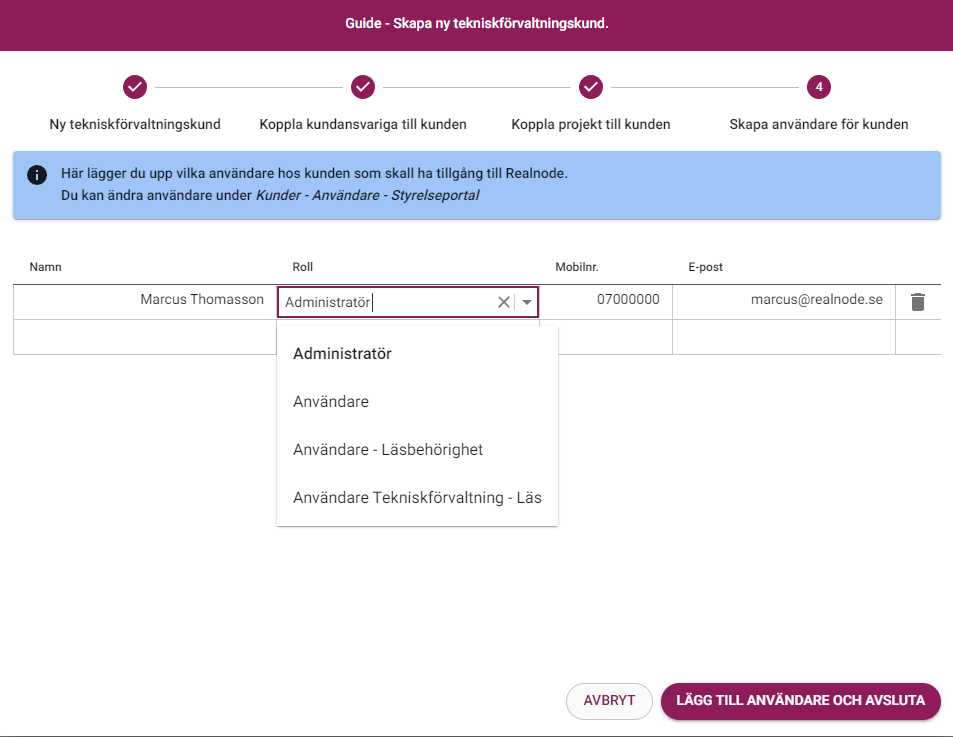 Vänligen välj även om kunden är en bostadsrättsförening eller ett företag/offentlig sektor. Du kan också ange vilken nivå av tjänster kunden ska ha tillgång till. Normalt sett väljer vi "Tekniskförvaltning Pro" som standardalternativ.