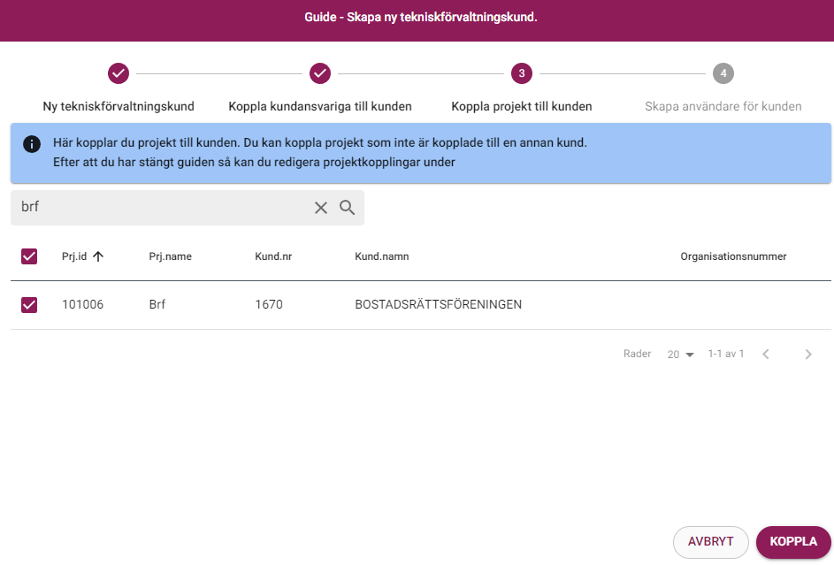 Här har du möjlighet att koppla ett eller flera projekt till kunden. Du kan även lägga till fler projekt i efterhand.