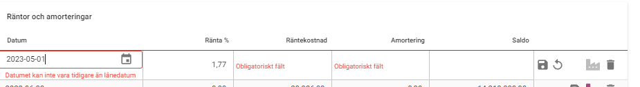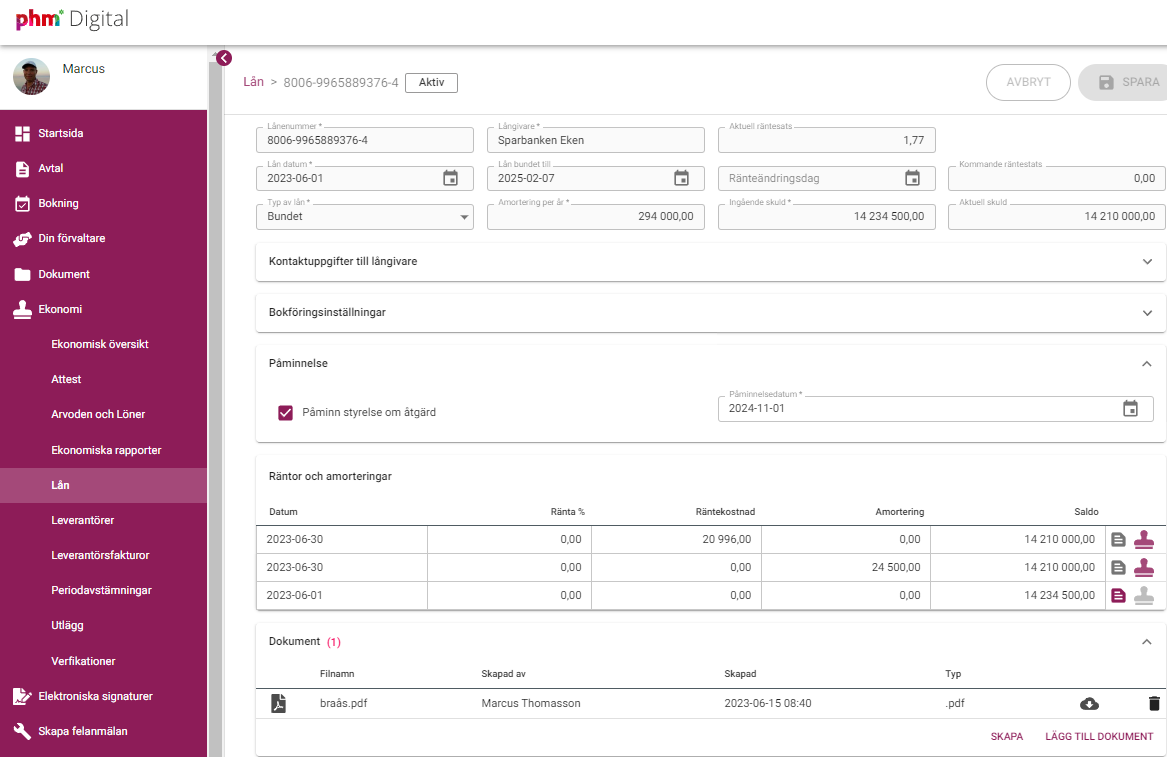 I PHM Digital har förvaltaren möjlighet att ange information om föreningslån. Informationen som är obligatorisk är lånnummer, långivare, lånedatum, räntesats, låntyp, årlig amortering och ingående skuld.