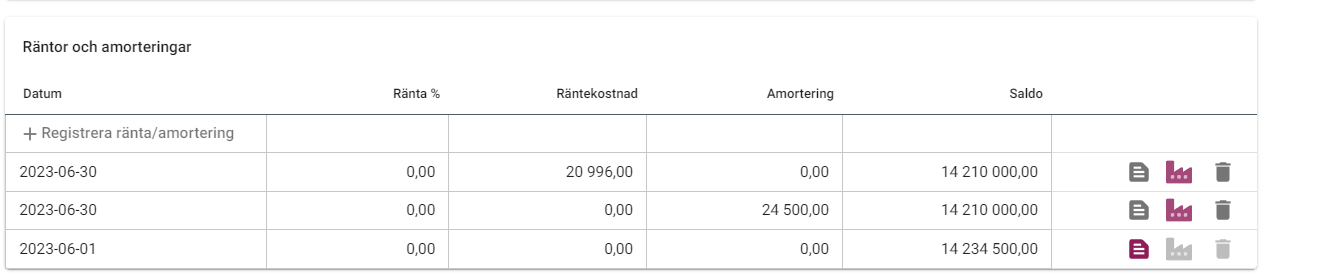 Förvaltaren och användaren har möjlighet att se de amorteringar och räntor som har kopplats från inkommande leverantörsfakturor som separata rader. Varje rad representerar antingen en amortering eller en ränta som har blivit kopplad från leverantörsfakturan.